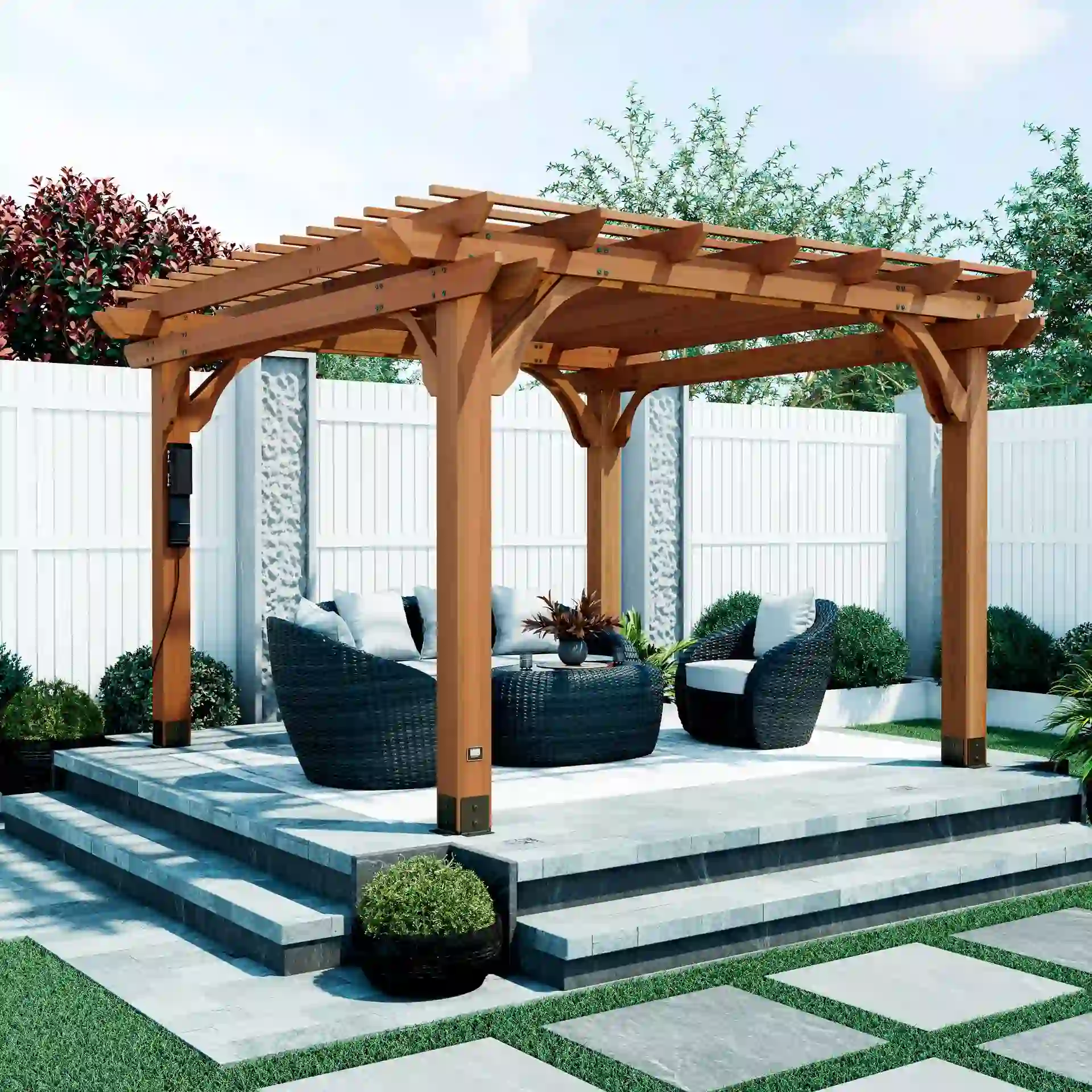Beaumont Cedar Pergola Kit includes a built-in “PowerPort” knockout specifically for integrating fans or lighting. Many custom builders use it as a base, then expand or adapt the frame for personalized installation. Its quality timber, workmanship, and modular nature make it a popular foundational reference for custom projects.