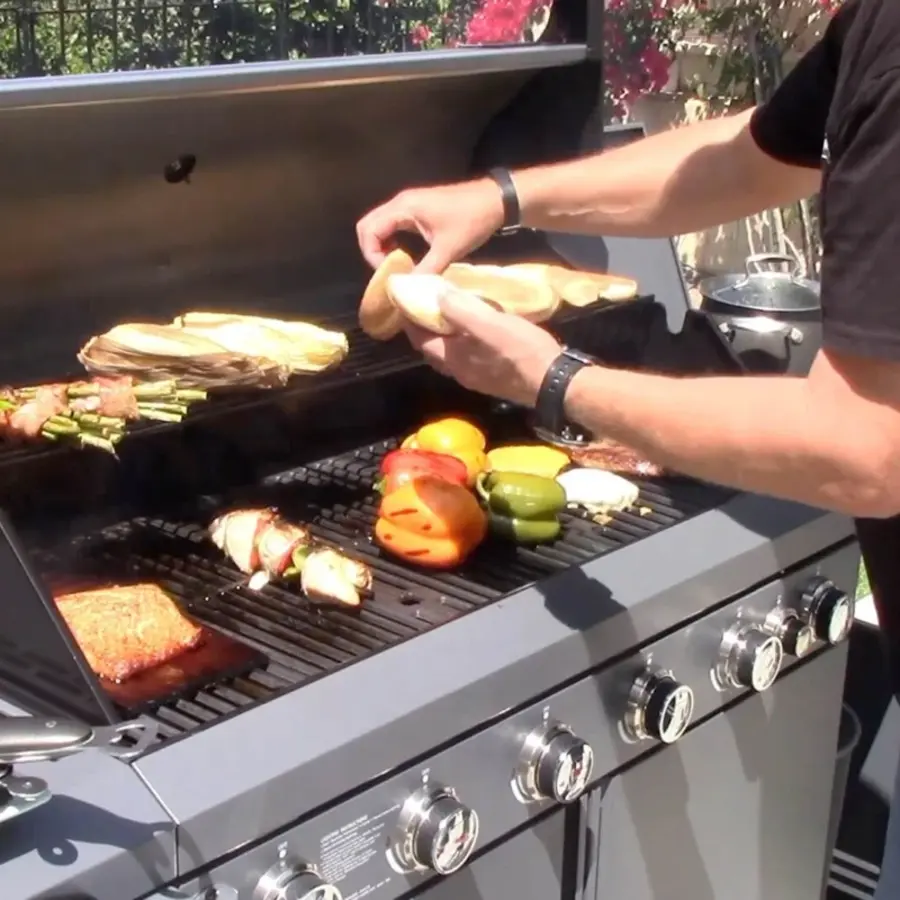 This griddle offers a flat-top cooking surface with three burners and side tables. It complements grilling with flexible surface cooking for pancakes, stir-fries, vegetables, or breakfast.